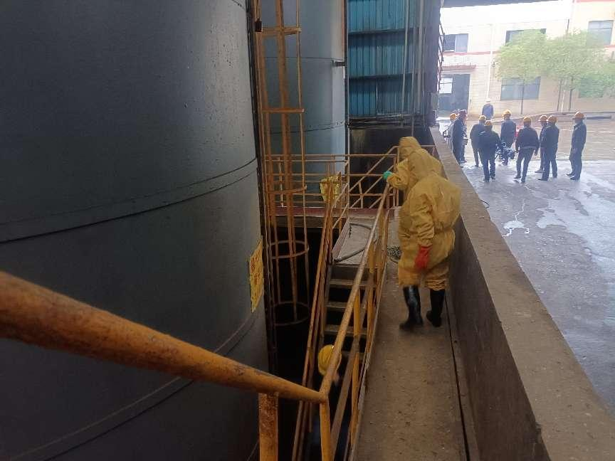 The rescue team entered the accident area to deal with the accident site. Due to the leakage of the front flange of the manual valve at the bottom of the sulfuric acid tank, the patrol personnel did not wear protective equipment, and the sulfuric acid scalded the face and eyes. The emergency team was in place quickly and the leakage was controlled. All the accident waste water generated in the rescue process enters the fire emergency pool.